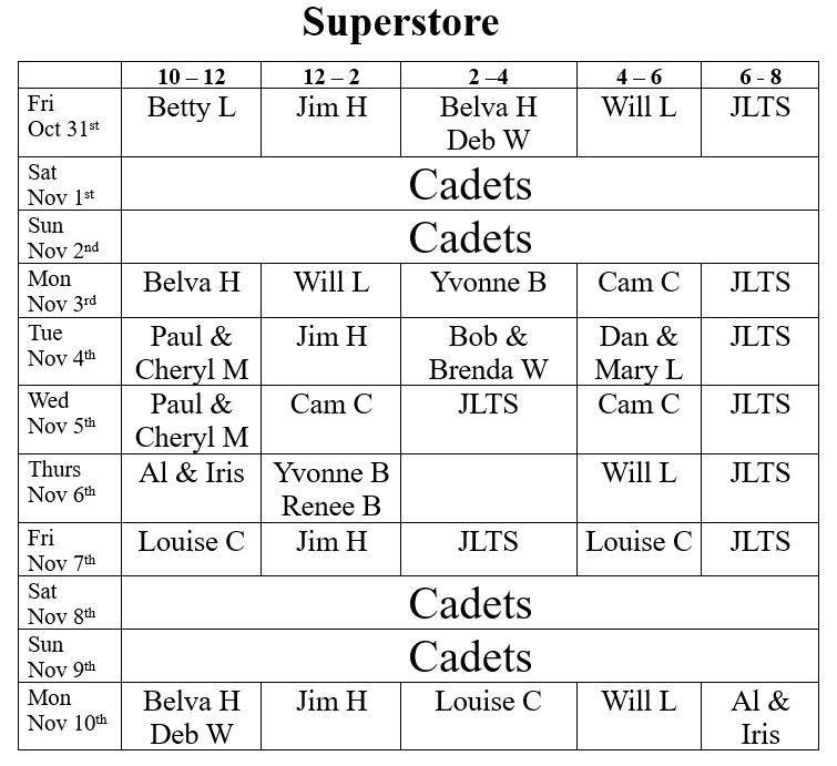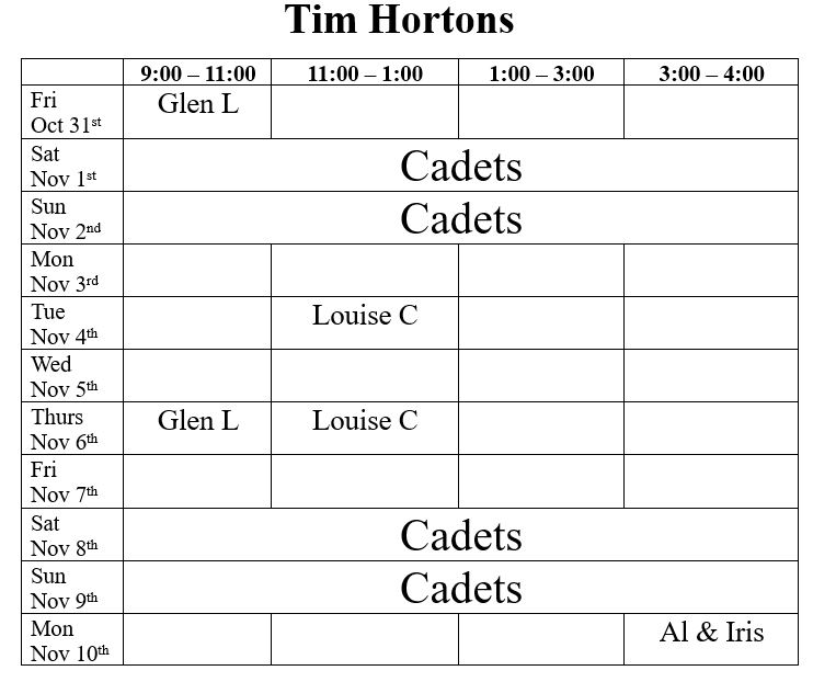 Volunteers are needed to distribute poppies at the Superstore and at Tim Hortons. The schedule below will give you an idea of the time slots available and if you want to volunteer, then add your name to the schedulees posted in the foyer of the Branch.